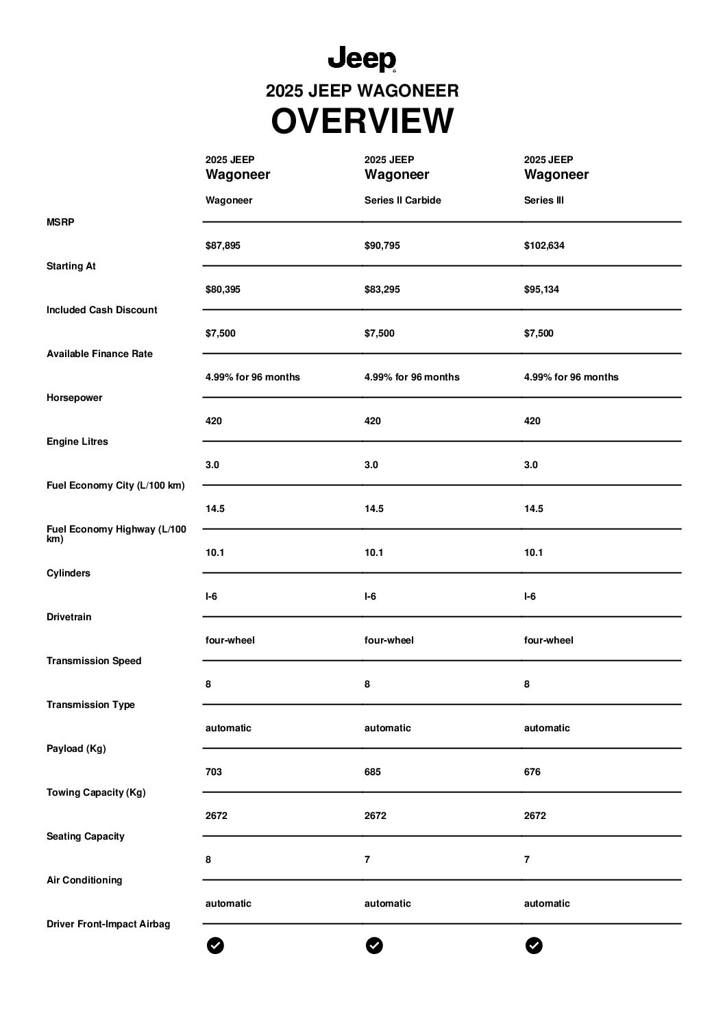 The Wagoneer, when equipped with the Heavy‑Duty Trailer Tow Package, has the foundation and the power to boast Best‑In‑Class towing capacity of up to 4,535 kg (10,000 lb). That’s enough to easily tow a typical 9 metre, 2‑axle travel trailer, or a large 8 metre, centre console boat. Included with the package is an electronic limited slip rear differential and integrated trailer brake controller.