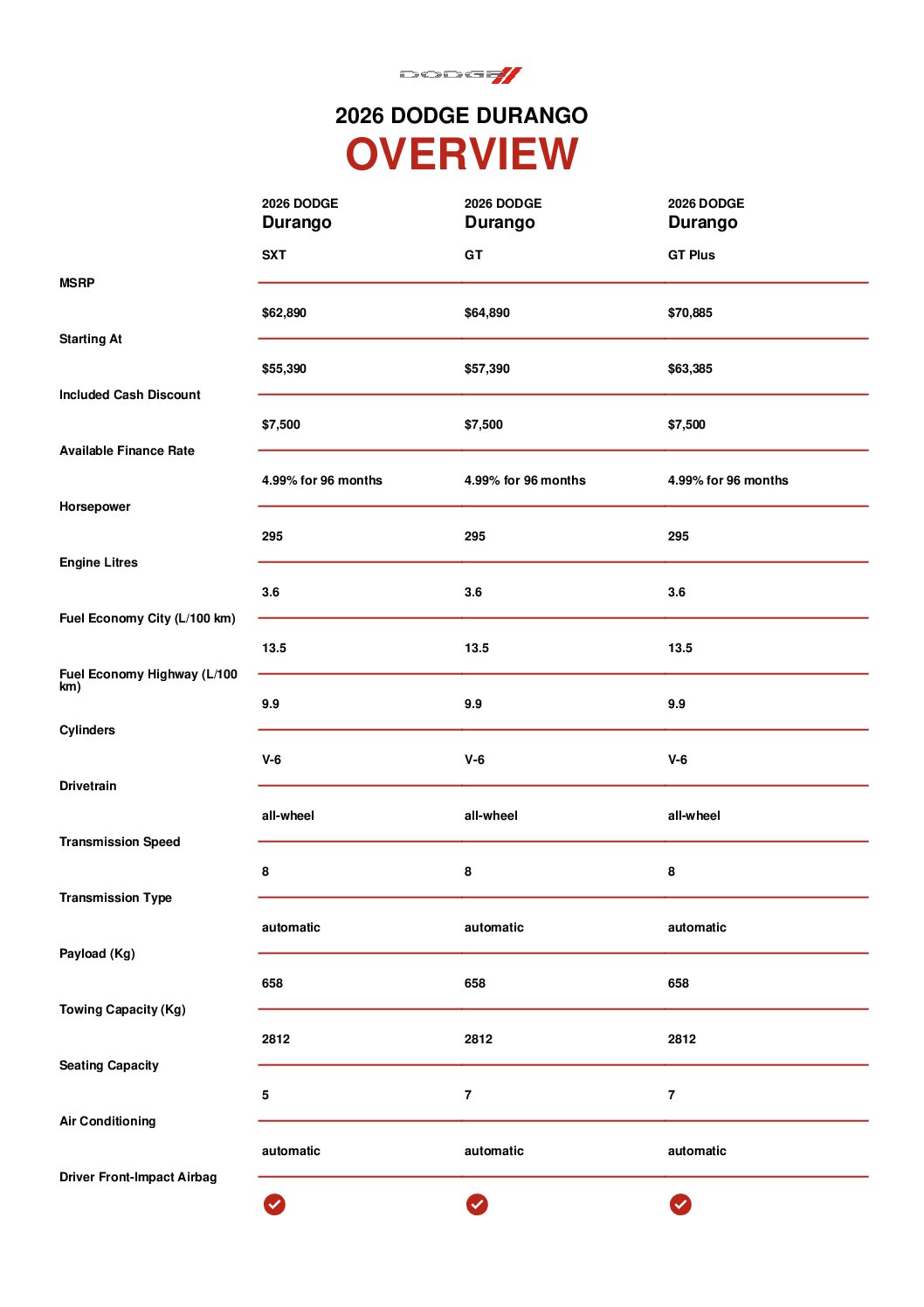 Available on GT Plus, GT HEMI® V8 Plus and GT HEMI V8 Premium trims, the Blacktop Redline Package brings bold design inside and out with front and rear SRT® spoilers, available dual stripes, Leather and Alcantara® Suede SRT Performance Seats, and other standout details.